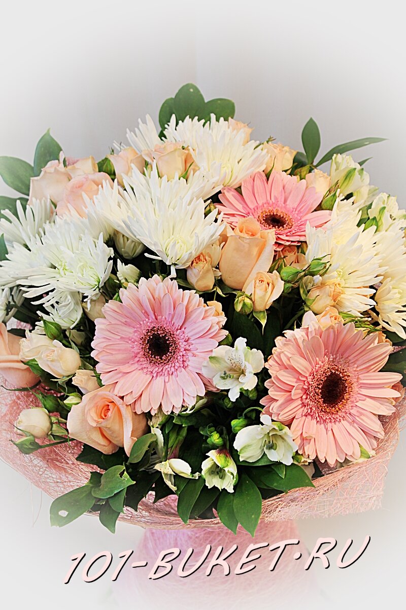 Средний (на фото): 5 роз, 5 кустовых роз, 3 альстрёмерии, 4 хризантемы, 3 герберы, рускус, упаковка.